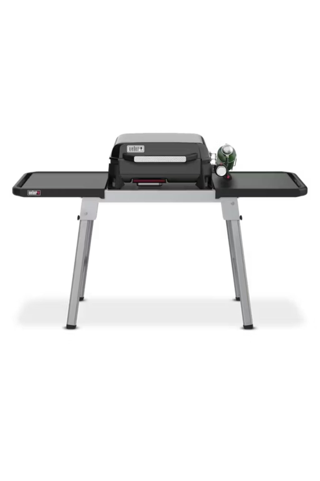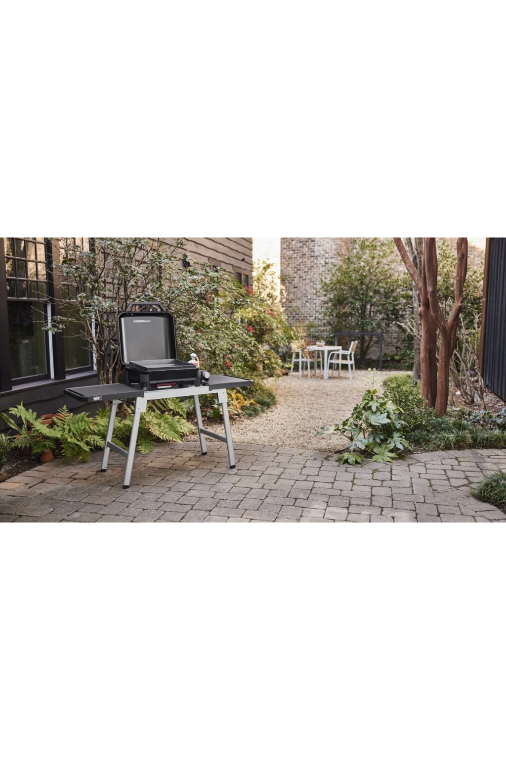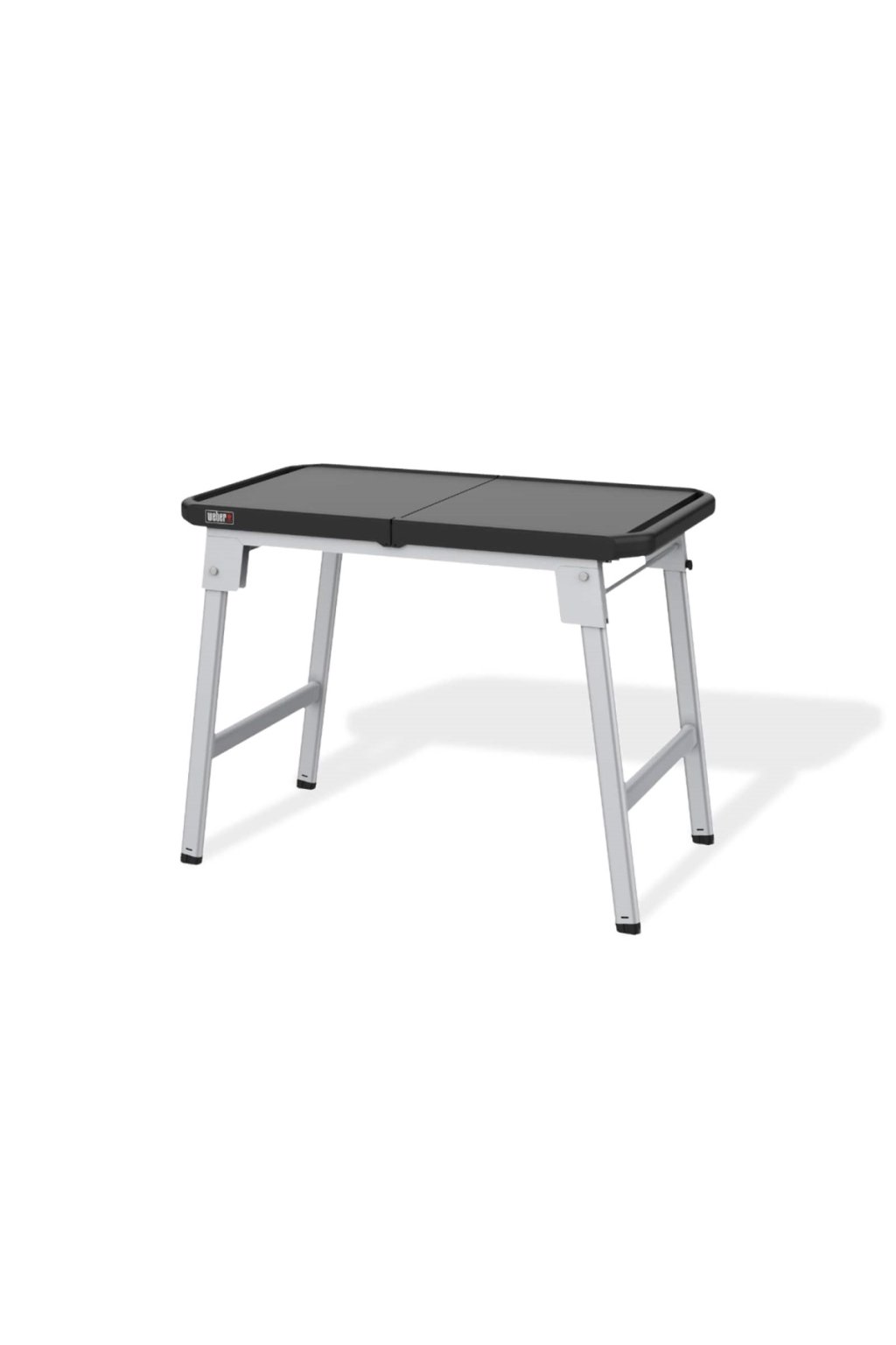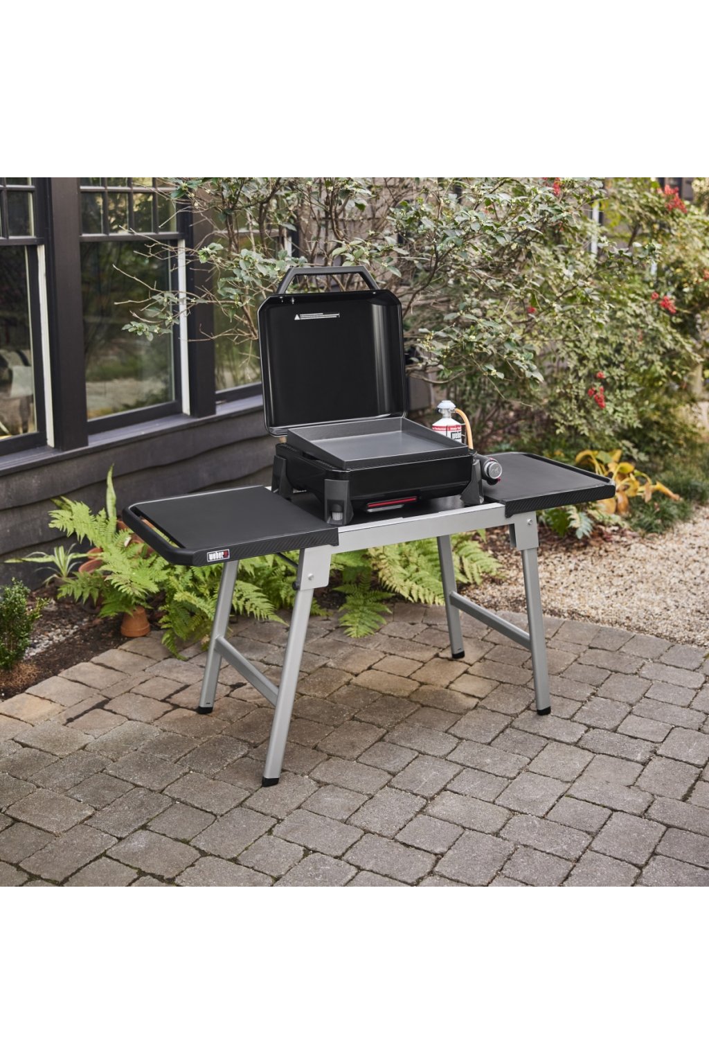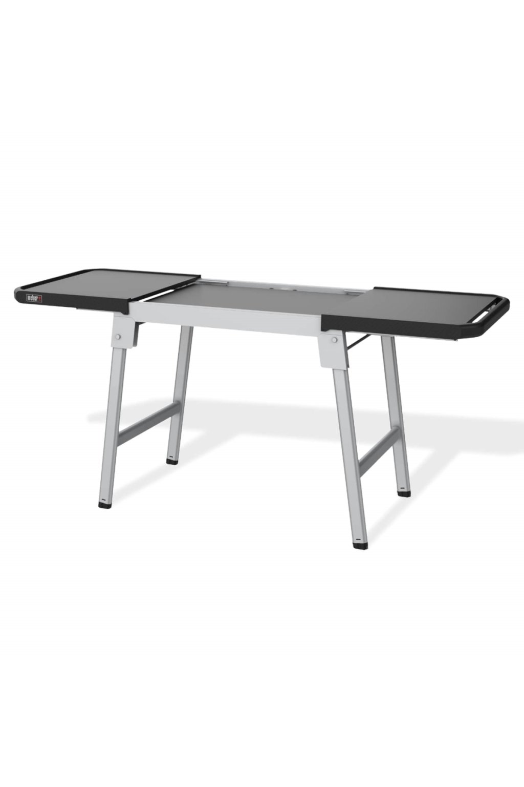 Skládací stolek pro snadnou přepravu. Dva boční stolky pro přípravu. Nastavitelné nohy udržují stojan a gril v rovině. Boční stolky se mohou zasunou, aby vytvořily stůl na servírování. Kompatibilní s příslušenstvím Weber Works (Snap-on).